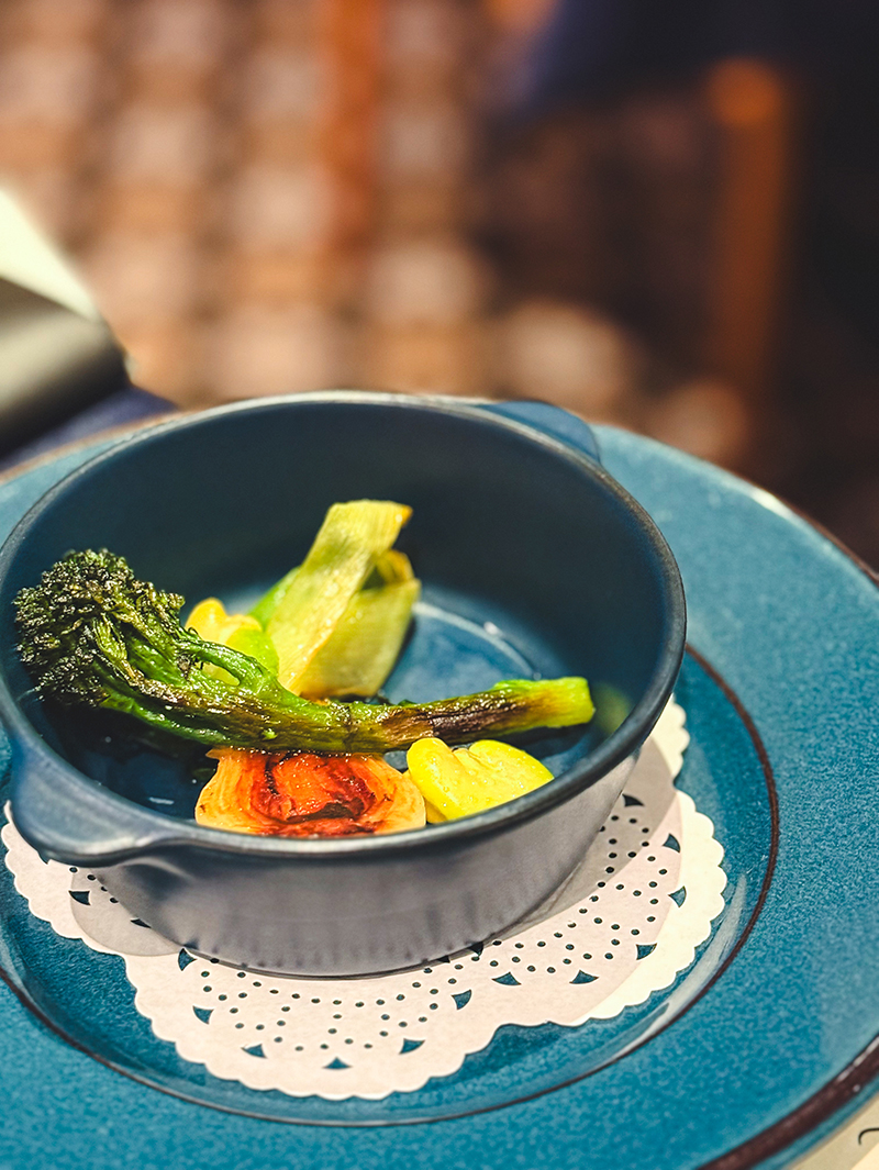 つけ合わせには、新玉ねぎ(淡路島 洲錦(しまにしき)辛味・うま味・甘みを絶妙なバランスで三味一体の奥深い味わいに作り上げた玉ねぎ)、スティックセニョール(静岡県産)、そら豆(鹿児島県指宿産)