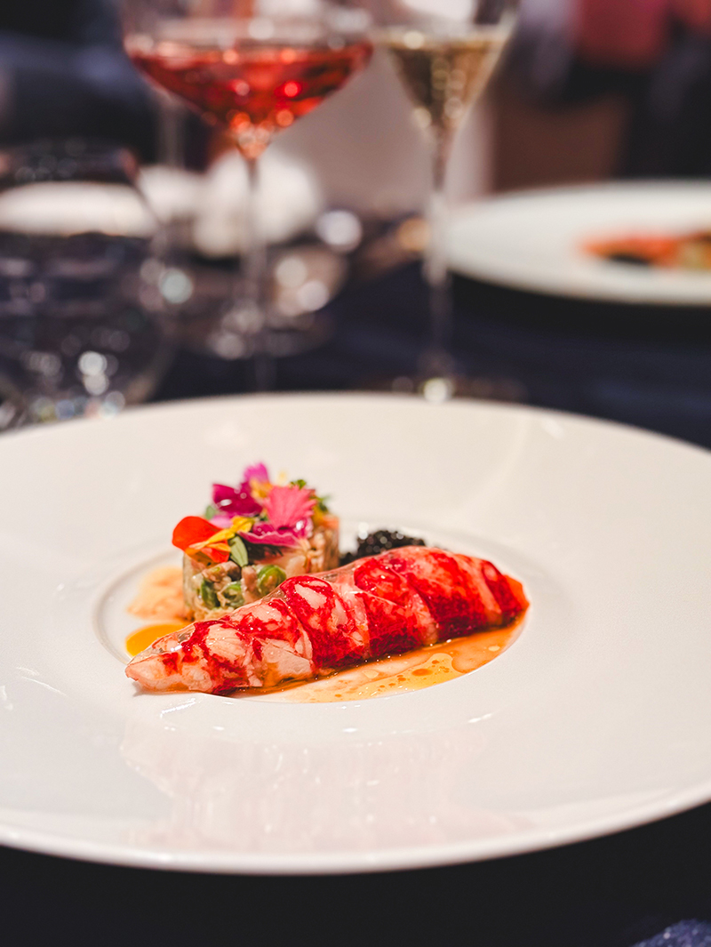 さわやかなにわとこのジュレを纏った美しいオマールブルーの赤色が映える一皿。