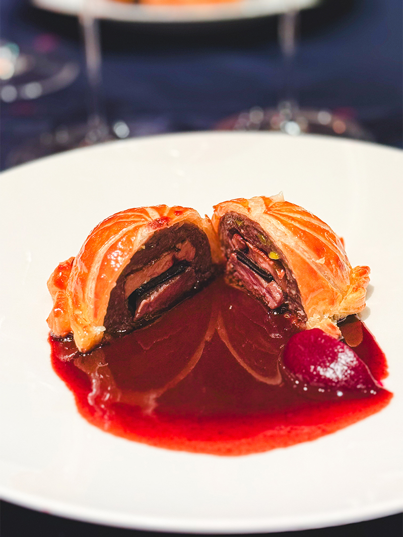 トリュフ、フォワ・グラの香りがパイの中から香りを放ち、しっとりとしたパテと芳醇な赤ワインソースが絶妙な一皿